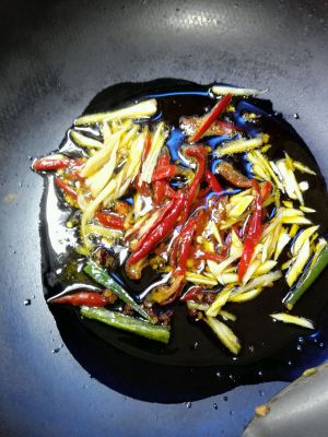 净炒锅下油烧热,下泡辣椒丝,泡姜丝,蒜丝,青辣椒丝,炒香