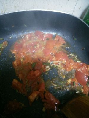 葱蒜出来香味以后,放入切碎的西红柿,炒化,放盐