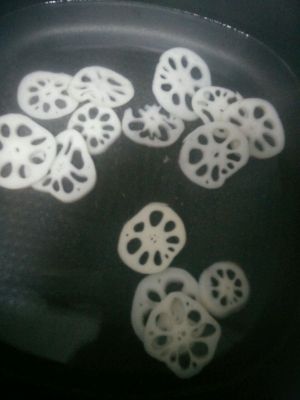 烧一锅开水,放盐,先把藕片放锅中煮,因为藕片不容易煮烂。