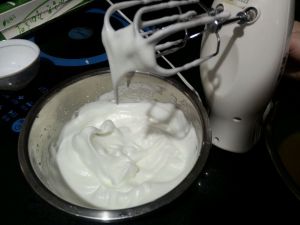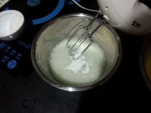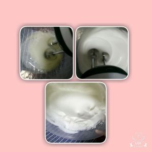 蛋清打发,分三次加入糖粉,先低速打散蛋清,再高速打发至体积膨胀变成纯白色,再中速慢慢搅打