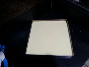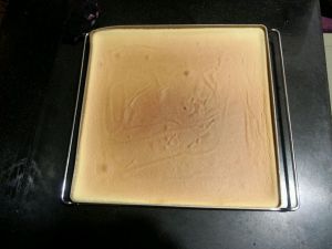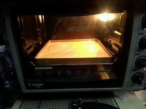 将拌好的蛋糊倒入铺好油纸的烤盘中抹平,200度烤箱中层10分钟,然后调到160度再烤25分钟.