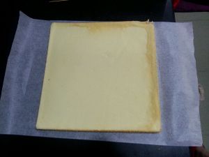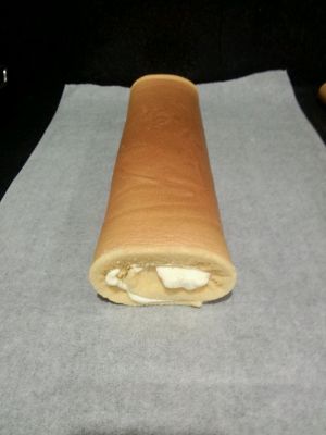 烤好的蛋糕卷取出,倒扣在另一张油纸上,撕开蛋糕底部的油纸,放凉后卷起即可。