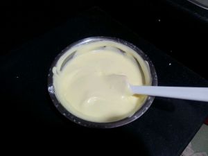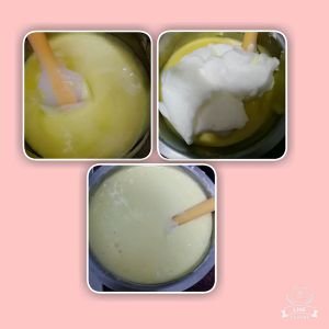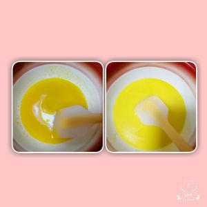 将图二里蛋黄+玉米油+白砂糖搅拌均匀后 分多次的加入50g牛奶 每加入一点牛奶就充分搅匀 这样才不会油水分离严重