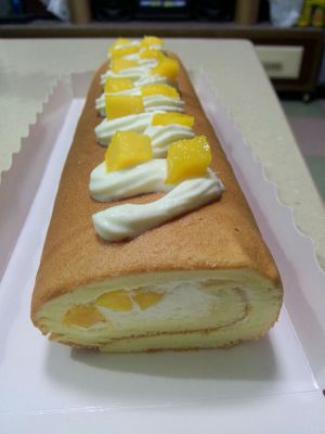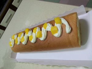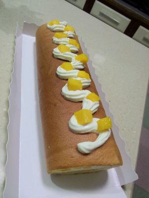 淡奶油隔冰打发,烤好的蛋糕马上倒扣在烤架上,切去四个硬边,抹上奶油,趁热卷起.放凉后切块即可.