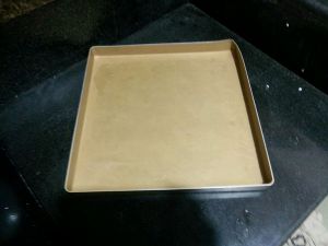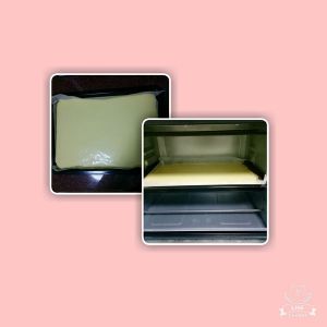 将蛋糕糊倒入铺有油脂的烤盘中,用刮刀刮平表面,震两下,放入175度预热好的烤箱中,烘烤18分钟左右。