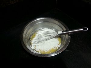 在蛋黄中加入水和玉米油,搅打两分钟。