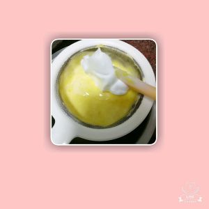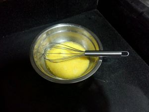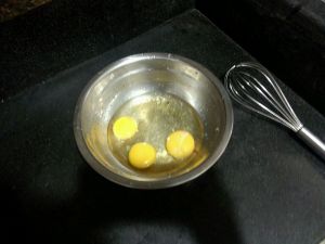 蛋清,蛋黄分离。取三个蛋黄,用手动打蛋器搅打2分钟。