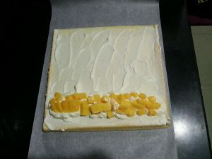 再把提前打发好奶油,切好水果铺在蛋糕上