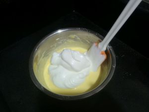 取三分之一的蛋白霜倒入蛋黄糊中,翻拌均匀,再倒回蛋白霜中。