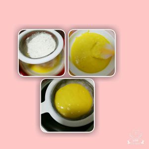 回到保留着的第4步 舀一小勺打发好的蛋白加入筛子里的蛋黄中 搅拌均匀 面糊会很容易的过滤 这步会需要多一丢丢时间
