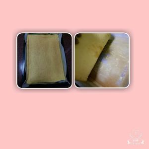 拿一条牙签在烤盘四周先移动一下方便脱模,剪一块油纸铺在烤盘上再翻面把蛋糕倒出来,然后撕开油布