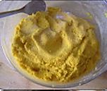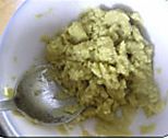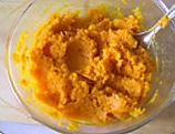 蒸熟的南瓜加入少量白糖,用勺子把它搅拌成蓉。