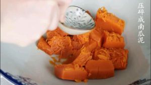 蒸熟的南瓜去皮,碾压成泥;