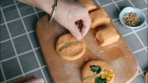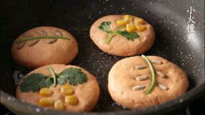 剂子揉圆再压成饼状,加入香菜茎叶、熟玉米粒、瓜子仁进行装饰,发挥你的小宇宙吧;