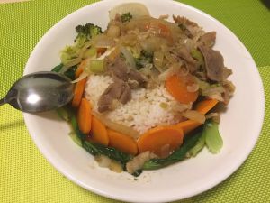 将提前蒸好的米饭放好,摆上胡萝卜,小白菜和菜花,浇上肥牛酱汁。搞定!!!