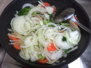 热水烧开,将小油菜和菜花焯好放入凉水(为保持绿菜的颜色和口感),然后控水待用。然后将洋葱和胡萝卜放入大火煮15分钟,捞出控水待用。焯菜的水保留。