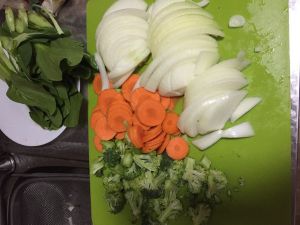 洋葱顺纹理切丝,胡萝卜去皮切片,菜花切块。