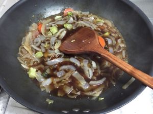 将蔬菜水中倒入生抽、蚝油、白糖和胡椒粉,大火煮开,熬成酱汁待用。然后热锅热油煸炒焯过洋葱。然后倒入酱汁煮开。