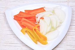 羊排洗净,洋葱切丝、胡萝卜切片、黄彩椒切条。