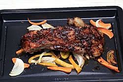 烤箱提前预热200度,将黄油放在烤盘上融化,铺上洋葱丝、胡萝卜、彩椒条片最后放上羊排,进烤箱上下火220度烤15分钟。