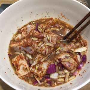放入盐、孜然、辣椒面,少量水,搅拌均匀后,腌制2小时。