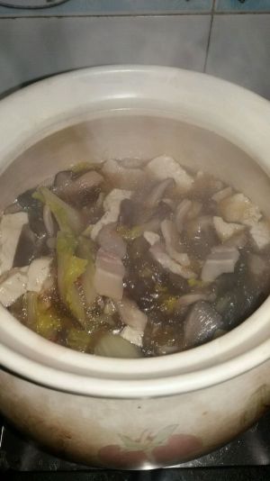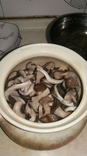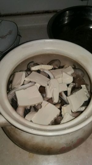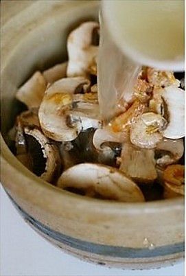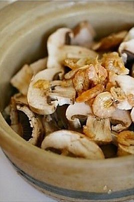 将切好的白肉片、口蘑片、海米都放入砂锅中