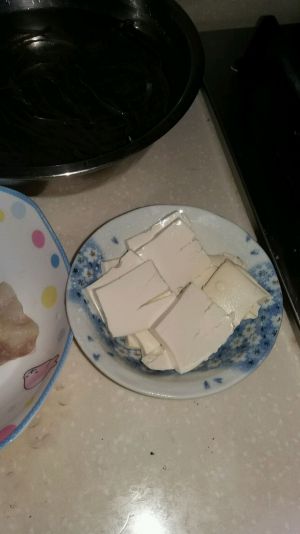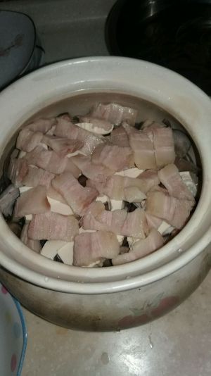 五花肉切薄片,越薄越好吃。铺在嫩豆腐上。