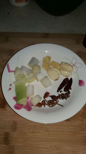 调料很简单,葱姜蒜切大块,花椒大料干辣椒少量,不要干辣椒也很好吃。