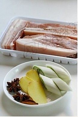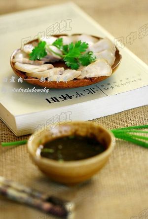 白煮肉 材料:五花肉1块约500克,葱白2段,姜3片,大料2个 调味汁: 腌韭菜花1勺,红腐乳汁2勺,酱油2大勺,辣椒油1勺,香油1勺,蒜末,香葱末,香菜 五花肉切成大块,洗净后放入锅中,放入葱段、姜片、大料,加水没过肉(水要一次加够)