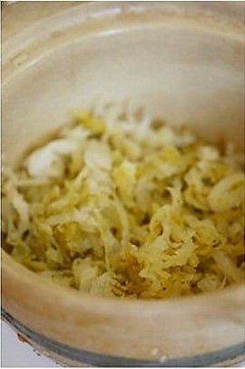 将酸菜切丝先放入砂锅垫底,将冷水泡好的粉丝码放到酸菜上,然后将肉片一层层码好;