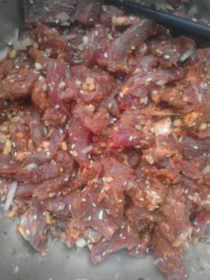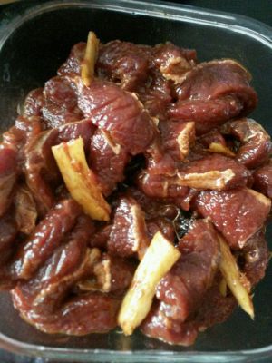 切段反复洗去血水,控干,除了胡椒粉,孜然粉外,其它料和牛肉一起拌匀,腌过夜