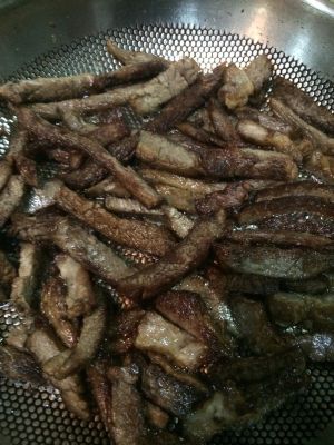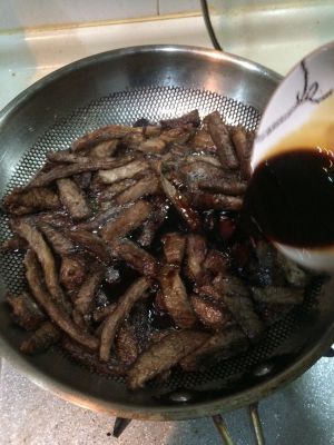 牛肉条要耐心慢慢的炒出水分,变干,表面微焦。把炒出多余的油倒掉。