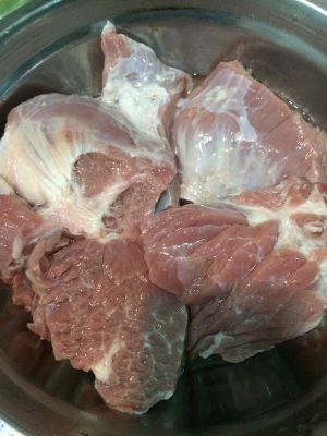 二斤牛肉切成拳头大小的块,泡血水。(牛腱肉有劲比较有嚼劲,或者选我买的这种肉,一样劲道很香,只要跟卖牛肉的说做牛肉干他就会帮你选哪个部位的肉了。)