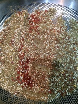 卤牛肉的时候另起锅,小火把花椒粉,五香粉,辣椒粉,白芝麻烘香。注意不要火大炒糊了。差不多1、2分钟有香味即可。