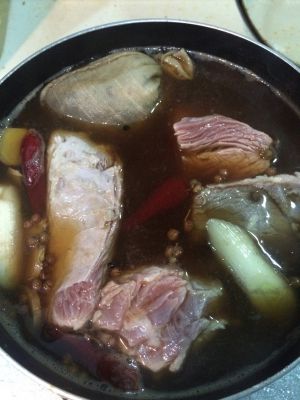 锅里烧热水,加入卤肉包(没有现成的就放家里有的花椒,大料,香叶,桂皮即可),加入干辣椒,黄豆酱,葱姜蒜烧10分钟以上,让香料味道充分发挥出来。