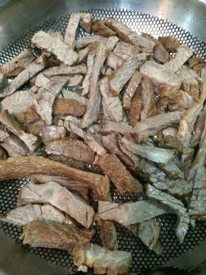 牛肉卤好后在汤里浸泡放凉,切成手指粗细大小条。锅里略微多放些油,把牛肉条小火煸炒。 PS(牛肉条要想手撕的感觉就要顺丝切、我这个是逆丝切的好咬一些,但是还是建议大家顺丝切有嚼劲)