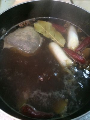 这里忘记拍照了。先用清水煮一遍,水开2分钟后捞出,然后把香料都放入高压锅,煮过的牛肉洗干净浮末放进去,加适量水,开火压15分钟,如果没有高压锅,就用炒菜的锅煮40分钟