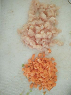 将胡萝卜,鸡胸肉洗干净切丁。小葱切碎