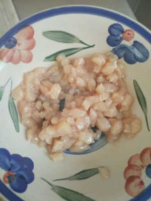 将鸡肉(小芽用鸡腿肉)焯熟捞出,切丁肉末,放在一边备用。