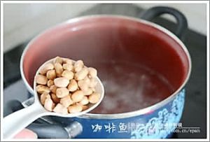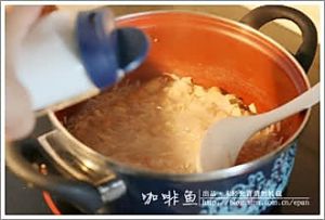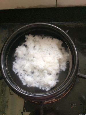 砂锅里倒入水和米饭一起烧至水开后,用小火熬煮