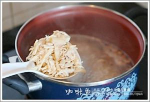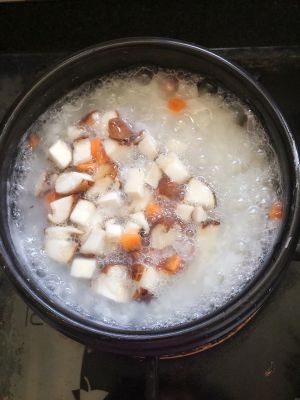 熬煮至有点粘稠时,放入香菇,胡萝卜一起熬煮
