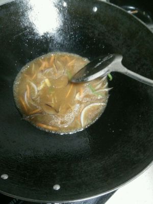 鱼煮个7-8分钟就差不多了,鱼出锅用盘子装好,锅中的汤汁继续烧,用一个小碗放一点生粉对水搅一搅倒到汤汁里勾芡浇到鱼身上最后把葱丝和小米椒放到鱼身上就可以了。