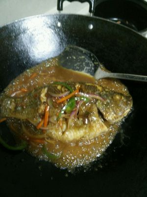 剩下炸鱼的油炒料 开小火,油热后放入花椒,姜丝,辣椒,大葱末,炒香后放鱼,加水,加用水化开的淀粉,大火煮收汁,汁收的差不多了就把鱼捞到盘里,然后汁里加鸡精,浇到鱼上,最后鱼上撒葱花,就完成了。