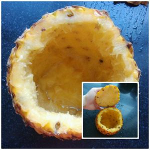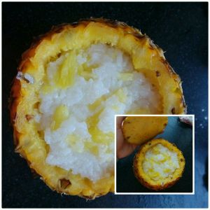 先将菠萝切掉一块留作盖子,之后用勺将菠萝肉掏空。注意:不要把菠萝掏烂了,菠萝肉和菠萝汁可以留作他用。