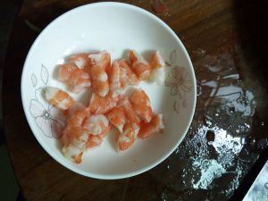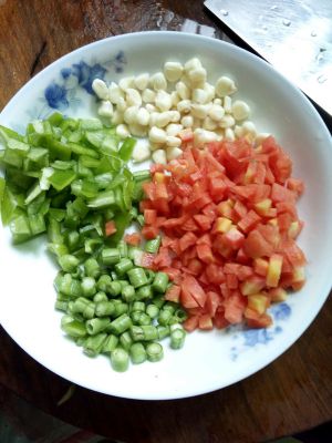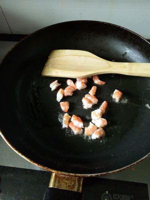 下调和油,先放虾,再放胡萝卜,豇豆,青椒,玉米