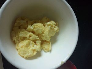 油温略热加入鸡蛋翻炒,再加入米饭炒至松散。