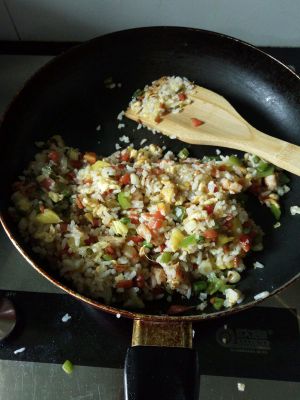 吵好后,放入米饭,我用的是剩饭。最后再放菠萝,一起炒,放一点盐