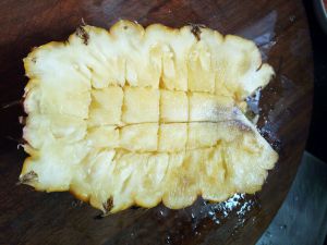 菠萝用小刀划过,再用勺子挖出来,有点难