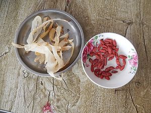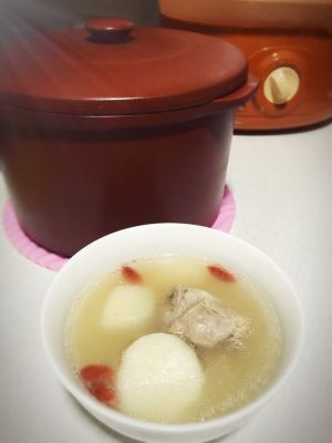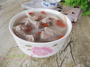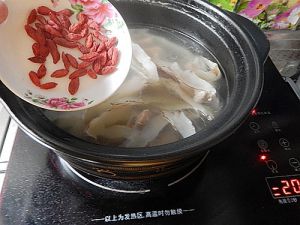 再放入适量的盐,荸荠和枸杞,再多炖十分钟,即可关火。