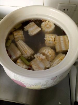 慢火煮15分中放入切成段的玉米。